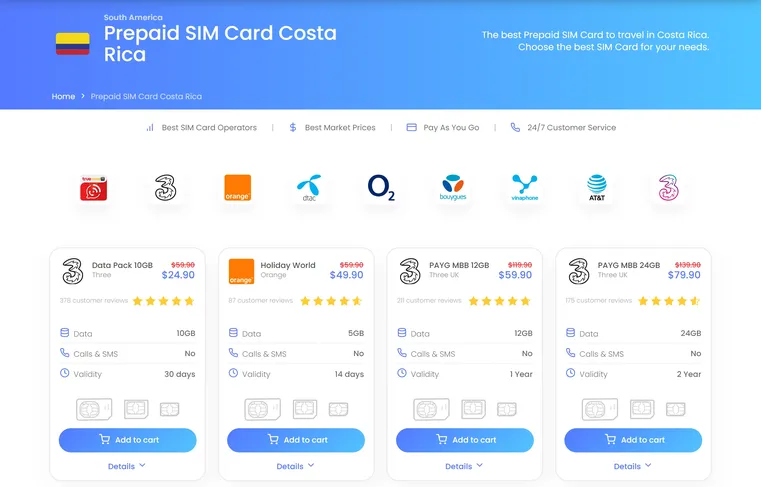 Du kannst eine Prepaid SIM Karte für Costa Rica online oder persönlich bei deiner Ankunft kaufen. Wir empfehlen dir, deine SIM Karte vor deiner Reise zu kaufen, damit du schneller ins Internet kommst. Die besten Prepaid-SIM-Karten für Costa Rica kannst du ganz einfach auf Simpackers vergleichen.