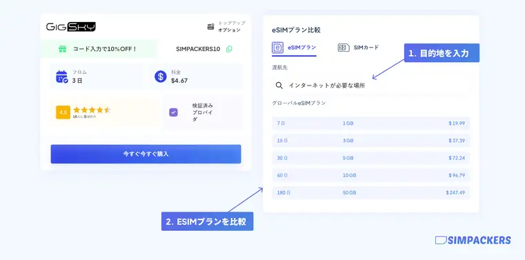 ご自身でを試してみませんか?このGigSky割引コード「SIMPACKERS10」で、初回GigSky購入が10%オフになります。